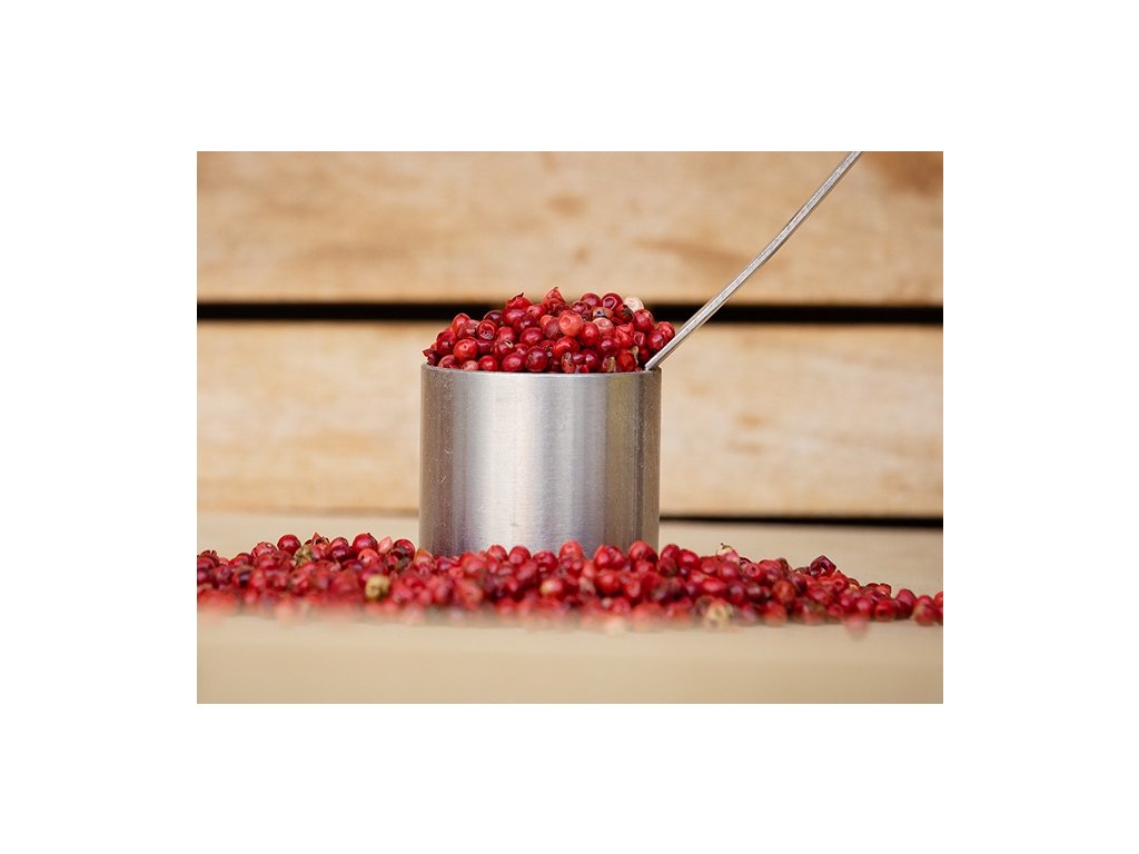 Pepř červený (Piper nigrum) je koření pocházející z nezralých plodů pepřovníku černého, původem z Indie. Sbírá se v době dozrávání do červené barvy a suší několik dní. Má jemně pikantní chuť a je oblíbený v různých kuchyních po celém světě. Používá se v omáčkách, polévkách, marinádách a jako dochucovadlo k pokrmům. Pepř červený je ceněný nejen pro svou chuť, ale také pro své tradičně přisuzované vlastnosti, jako je podpora trávení a zvýraznění chuti ostatních ingrediencí.